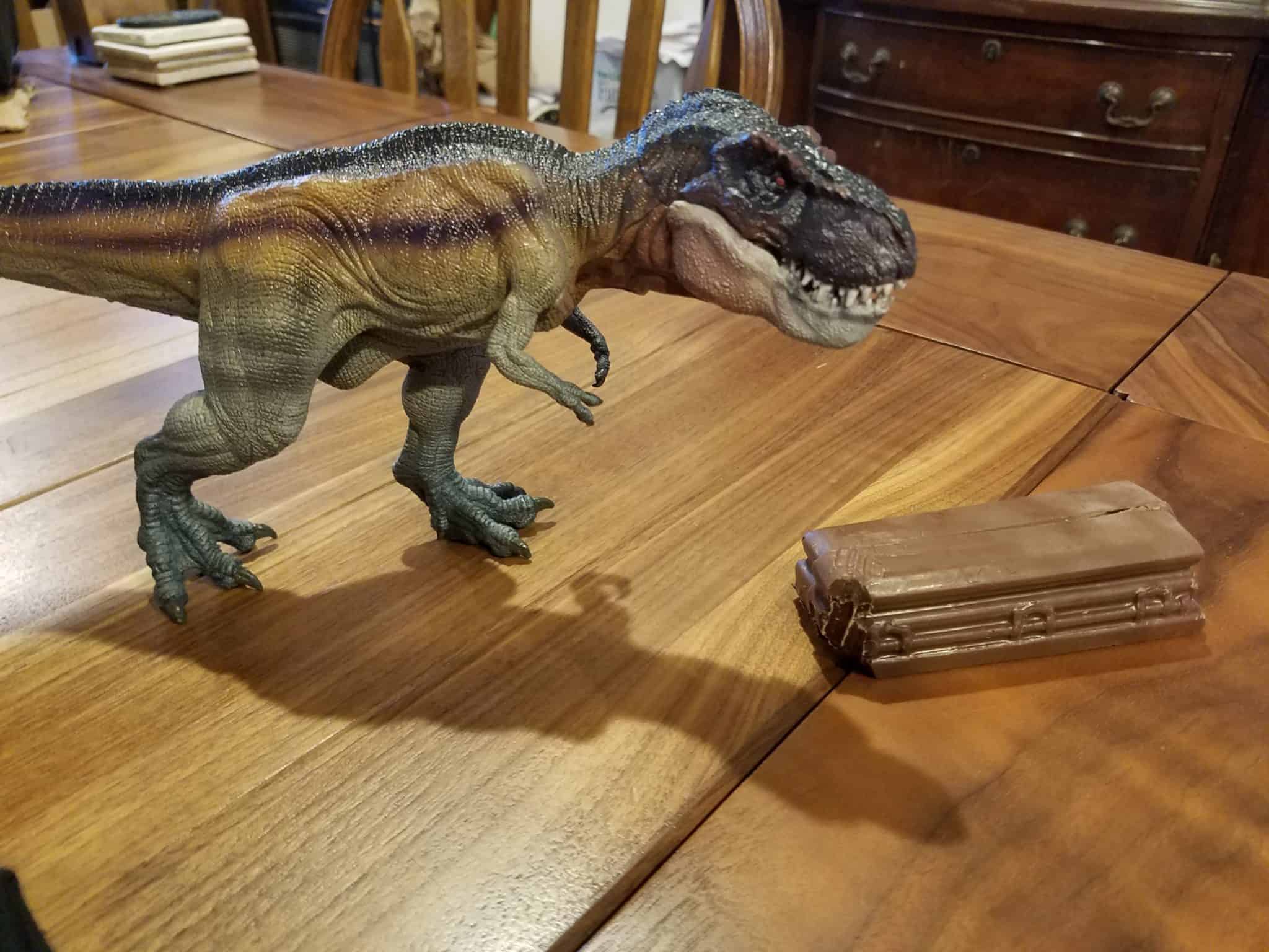 I took a few photos of the item as well, and because I was involved, my new T. Rex figure came out to play as well. (I have two more dino figurines, not counting Cupcake the Dinosaur, named Benny and Vinnie, but this one just came home with me last week and doesn’t have a name yet.)