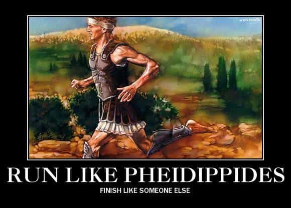 It is sad, however, that such inspiring motivational posters are inaccurate. “Run like Pheidippides. Finish like someone else.”