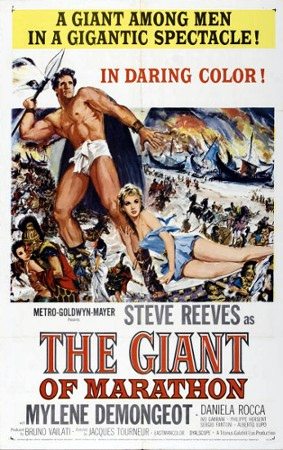 Because I have a masochistic delight in B-movies, I found The Giant of Marathon, a sword & sandal/peplum Italian production based on the historical battle of Marathon in the same way that Disney’s Pocahontas is based on an actual Algonquin princess’s life story. (Fun fact: According to John Smith’s memoir, he was saved from certain death by a gorgeous princess with a crush multiple times in his adventurous life. Sheesh, man, at least vary your story!) In this version Phillippides is not a professional long-distance courier, but a military commander of Athens’s Sacred Guard (which as far as I can tell exists only in this film — there was a Sacred Band a century or two later in Thebes, but according to sources they wouldn’t have been interested in the film’s female lead), and he brings back Spartans to fight and win, though Sparta never participated in the historical Marathon.