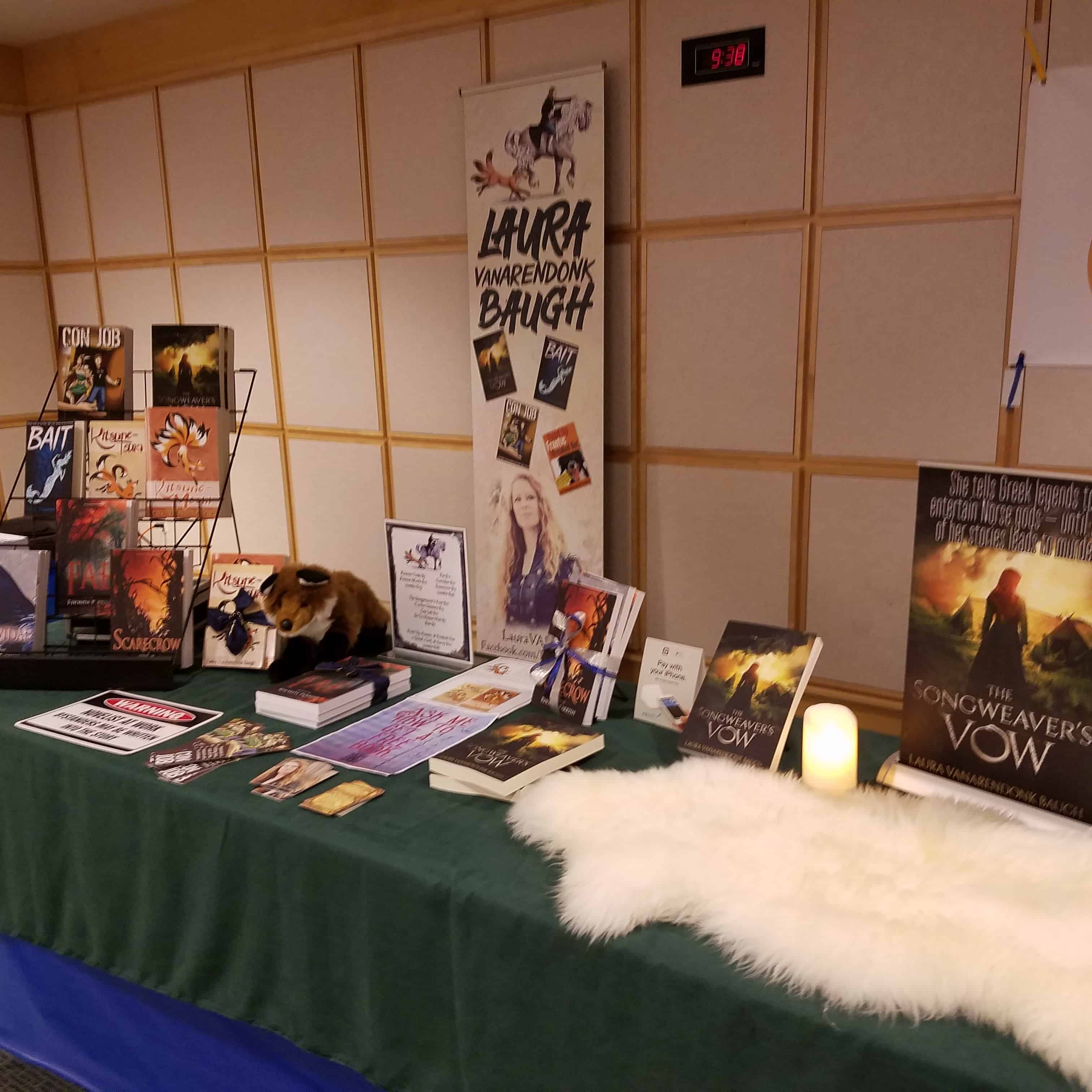 So here’s the story: I suddenly got an author table I hadn’t been expecting at a fandom convention where I was working. I had books and a banner in the car, but I didn’t have my usual table display materials and I didn’t have my full catalog of titles, just 8. I set up early and then went to help teach a thermoplastics for cosplay panel, leaving my table to be watched (theft prevention only, no sales) by the helpful staff overseeing the charity “flea market” setup. (Table rental went to a local hunger charity.)