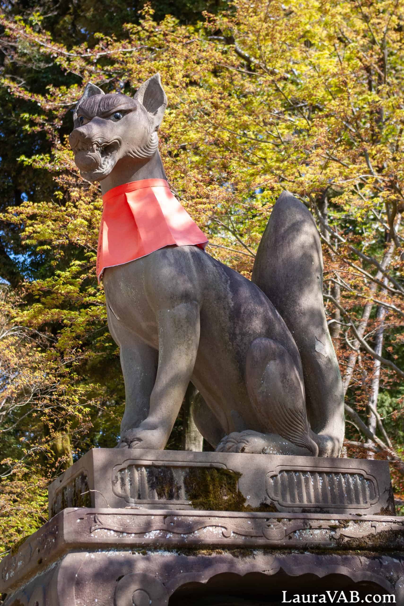 As you enter the shrine and ascend Inariyama (only ~760 feet/233 m but that’s enough in the spring or summer humidity), you’ll notice the hundreds of fox statues, large and small. Kitsune (the word refers both to the mundane physical fox and the fox spirit or youkai) are the servants or messengers to Inari. At shrines they are nearly always depicted in pairs, one holding a key to the granary and one holding a hoshi no tama, a “star jewel” of magic.