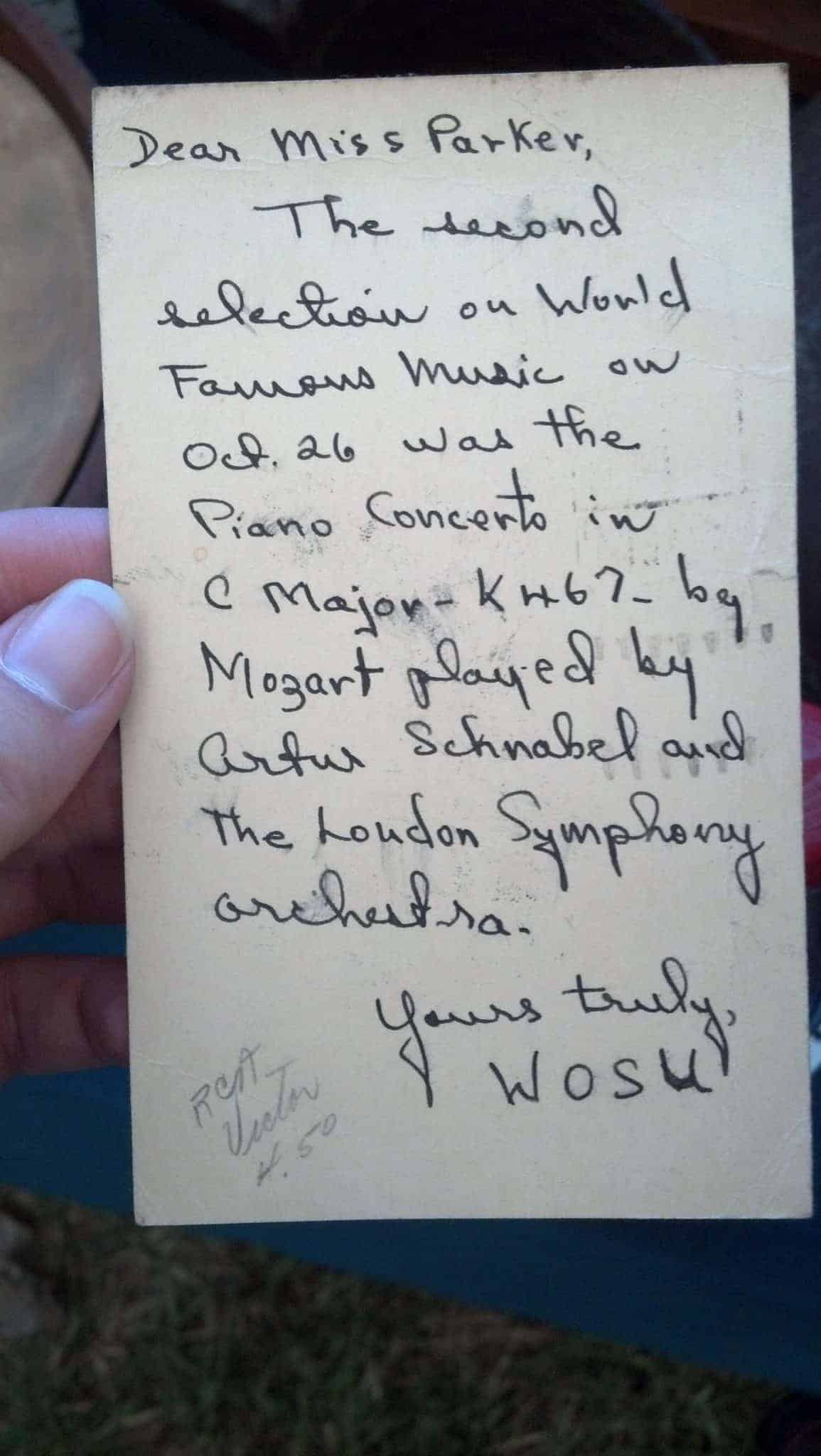 “Dear Miss Parker, The second selection on World Famous Music on Oct 26 was the Piano Concerto in C Major KH67 by Mozart played by Artur Schnabel and the London Symphony Orchestra. Yours truly, WOSU.”
