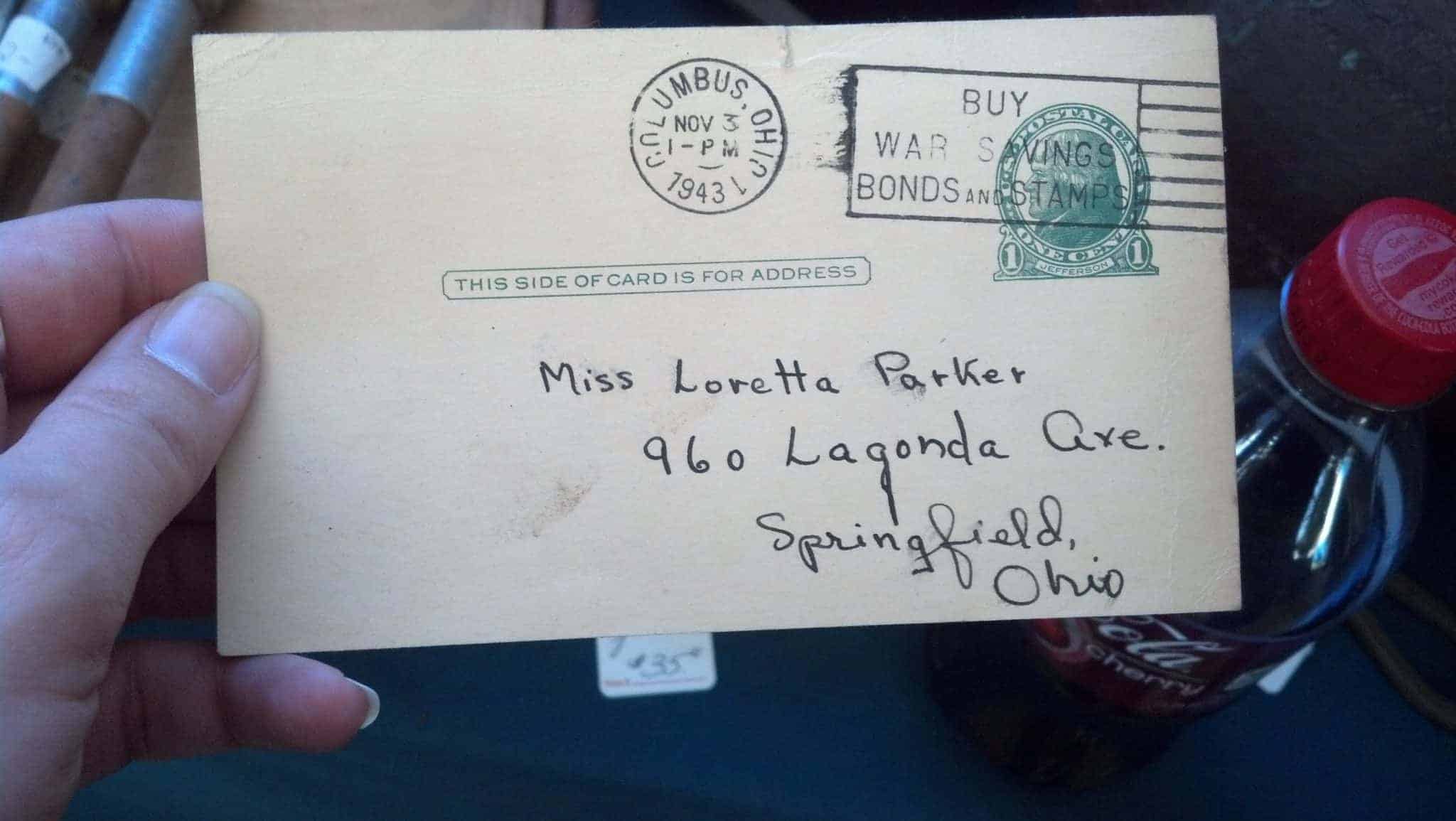 First booth offers a stack of vintage books. Flipping through one, we discover an old postcard. The neat handwriting and stamp cancellation verify its age. So what do we have?