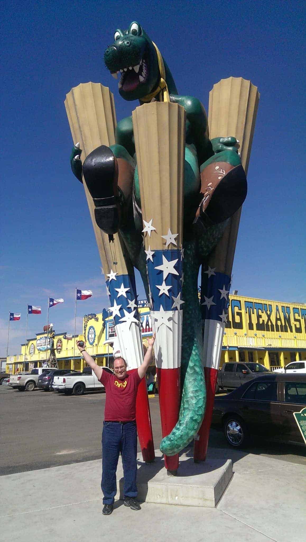 Jon waves at the base of giant green dinosaur dressed as a cowboy