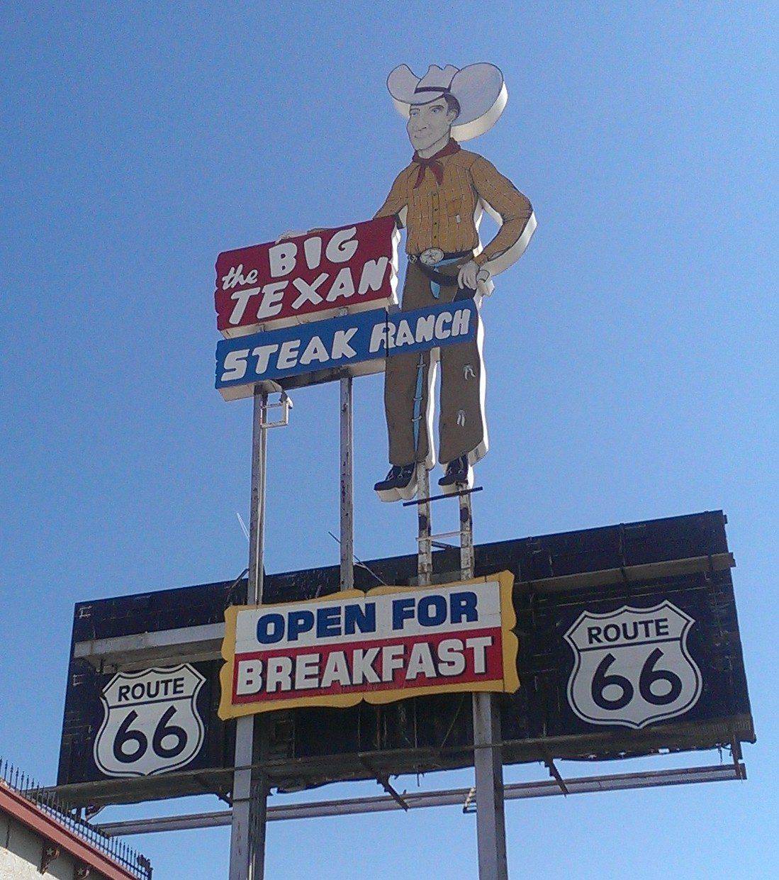 The Big Texan was once on Route 66, but when the interstate cut traffic, the struggling restaurant moved to I-40 to survive. The owners have never forgotten their Route 66 roots, though, and a giant concrete green dinosaur-cowboy (“Big Tex-Rex”) waits in the parking lot in true giant tourist trap Route 66 homage. There’s an attached motel done up as a western town, and there are rest areas for both dogs and horses, so you can turn your trailered horse to exercise in a paddock while you eat and then hit the road again. I remember hauling horses across distances, and that’s worth making the Big Texan a destination right there.