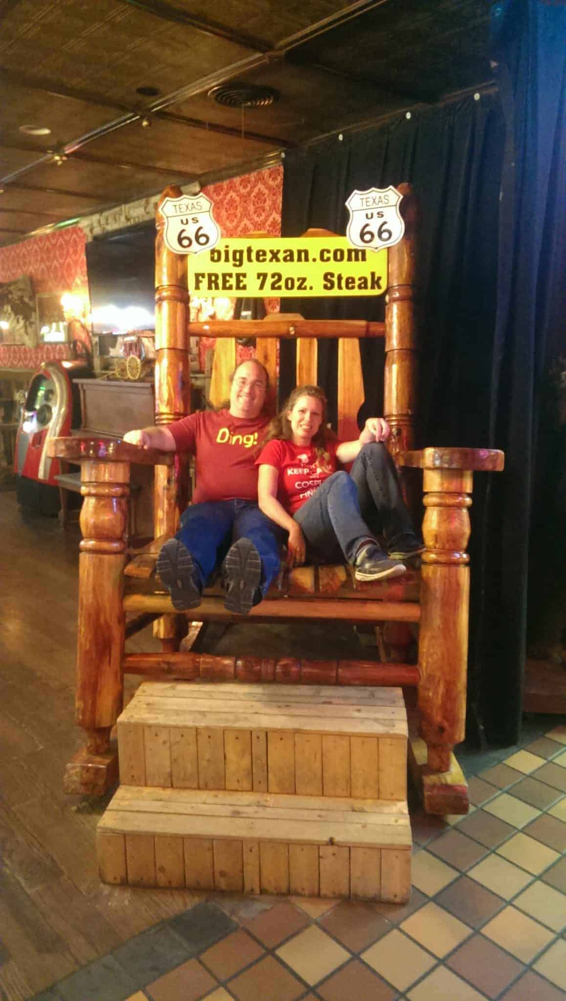 Jon and Laura sharing enormous rocking chair in the Big Texan
