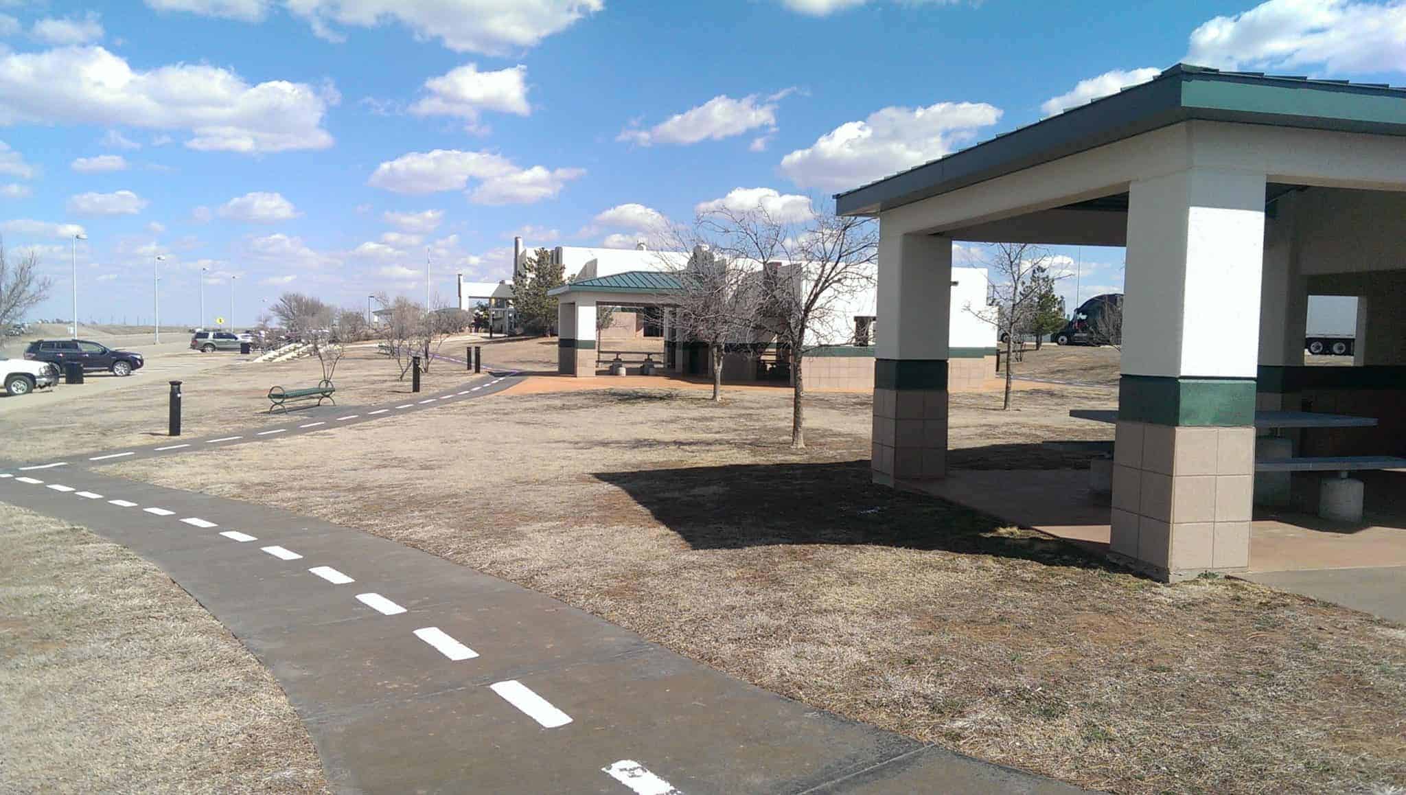 The Donley County Texas Route 66 Safety Rest Area is available from eastbound I-40 and is worth a stop. The rest area is done entirely in art deco and neon and classic Route 66 style, and all the picnic shelters look like miniature old Texaco stations and are fitted with Texas-shaped grills for your roadside cooking convenience. The sidewalks are tiny white-striped highways, leading to several historic information plaques. Super cute!
