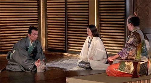 It’s actually one of my favorite scenes in the film. Kurogane has been dispatched to behead someone he considers innocent, and he knows the order originated with his susceptible lord’s scheming wife. He returns with the head as ordered, but when the wife unwraps it, she finds only the stone head of a fox.