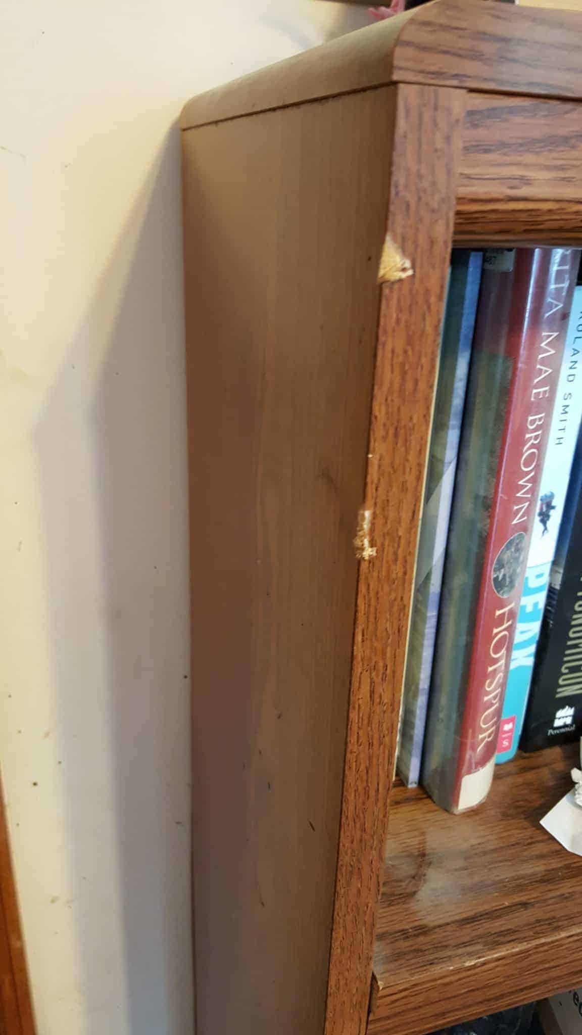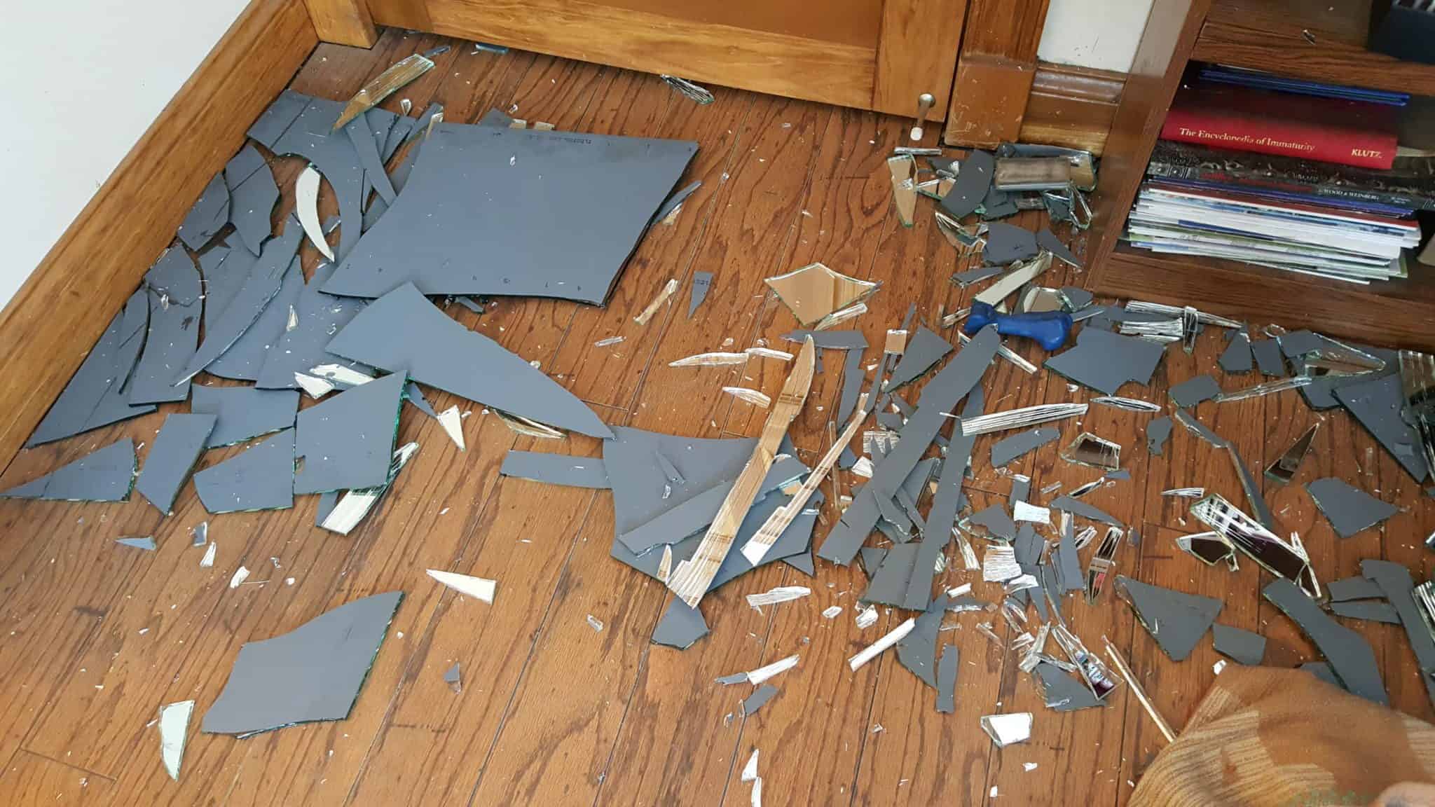 It’s hard for me to convey quite how violent this explosion was. My laminate floor, which has borne up under more than a decade of 50-90 pound dogs without a scratch, has a dozen gouges from the glass. There were shards of glass actually protruding from my bookshelf and pieces on each shelf. There was glass in my closet, which was around the corner from the event itself. There was glass inside the dog crates.